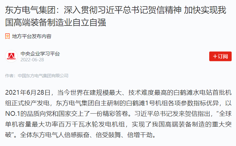 2021年6月28日,当今天下在建规模最大、手艺难度最高的白鹤滩水电站首批机组正式投产发电,ag百家家乐集团自主研制的白鹤滩1号机组各项参数指标优异,以NO.1的品质向党和国家交上了一份精彩答卷 。习近平总书记发来贺信指出,“全球单机容量最大功率百万千瓦水轮发电机组,实现了我国高端装备制造的重大突破” 。全体ag百家家乐人倍感振奋、倍受鼓舞、倍增劲头 。