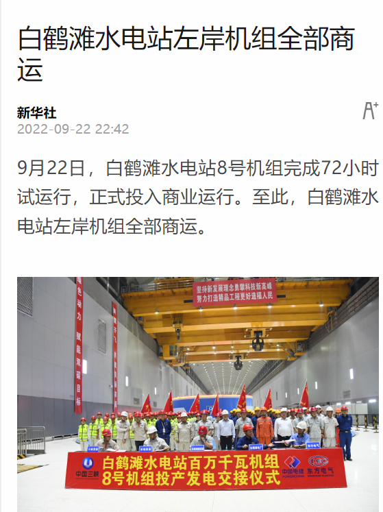 9月22日,白鹤滩水电站8号机组完成72小时试运行,正式投入商业运行。至此,白鹤滩水电站左岸机组所有商运。
