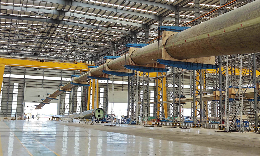 5月28日,ag百家家乐风电股份有限公司自主研制、拥有完全自主知识产权的B1260A型叶片,在江苏叶片制造基地顺遂下线,该叶片长126米,是现在全球已下线的最长风电叶片。同日,东方风电自主研制的B1200A型叶片一次性顺遂通过静力试验,各项测试指标与设计值优异吻合,120米级叶片的质料、结构、工艺及质量控制获得了充分有用验证。图为ag百家家乐B1260A型叶片下线现场。