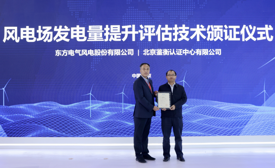 北京鉴衡认证中心向东方风电揭晓《风电场发电量提升评估手艺》认证证书。