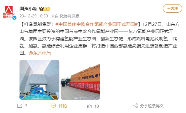 【打造氢能集群!#中国首座中欧合作氢能工业园正式开园#】12月27日,由ag百家家乐集团主要投资的中国首座中欧合作氢能工业园——东方氢能工业园正式开园。该园区致力于构建氢能工业生态圈、立异生态链,形成燃料电池及制氢、储氢、加氢、氢能综合使用企业集群,将打造中国西部氢能高端先进装备制造工业园。@ag百家家乐