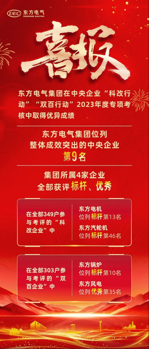 近本网讯 日,国务院国资委宣布中央企业“科转业动”“双百行动”2023年度专项审核效果,ag百家家乐集团在推进“科转业动”“双百行动”整体效果突出的34家中央企业中位列第9名。ag百家家乐集团所属4家企业均取得优异效果,其中东方电机、东方汽轮机划分位列“科转业动”标杆企业第13名、标杆企业第46名,东方锅炉、东方风电划分位列“双百行动”标杆企业第10名、优异企业第35名。